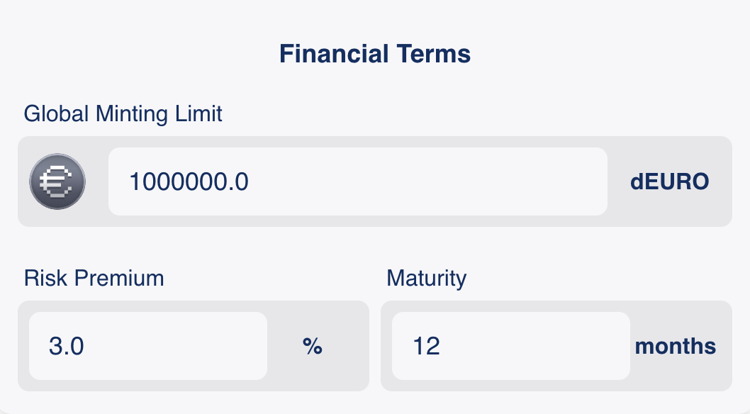The annual interest is charged upfront and can be set by the user. With a maturity of 12 months, this is the entire fee that is charged. Of course, if the maturity is set to 6 months for example, the final interest changes accordingly. The minting limit describes the maximum amount of Decentralized Euro that can be minted against this position and its clones. When the position is cloned, the remaining amount is split between the original and the clone. The purpose is to limit the exposure of the Decentralized Euro system to a single collateral. The Decentralized Euro should be able to withstand the total failure of one or more related collaterals, even if all their positions are maximally minted.