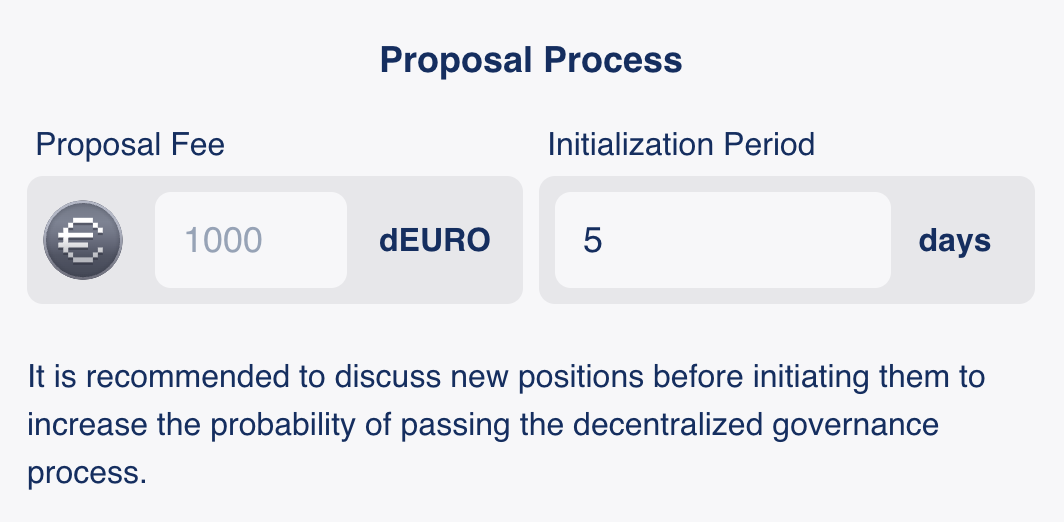 The proposal fee is fixed at 1 000 Decentralized Euro. This fee is not returned if the position is denied and goes to the equity holders. The price tag of 1 000 Decentralized Euro ensures that each proposal is well thought-out. Having a low fee would likely encourage the proposal of illiquid and/or otherwise unfit tokens. The initialization period has to be at least 3 days. This gives other system participants enough time to veto or to challenge the new position. A veto can only be cast by qualified pool share holders by calling the "deny" method on the position. If a position is denied, it cannot ever be used to mint Decentralized Euro, but it can still be challenged. New positions can be challenged immediately using the normal challenge mechanism.