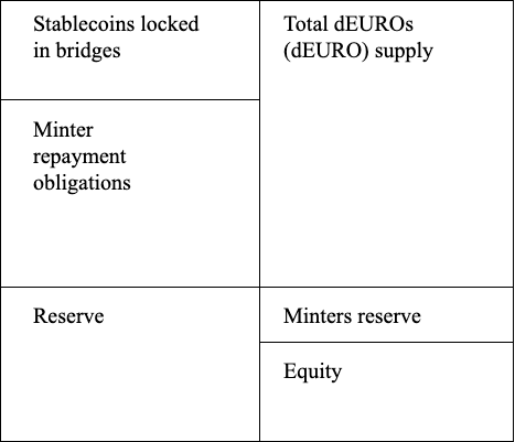 If the JuiceDollar system was a company, its balance sheet would roughly look as shown above. On the asset side, the system has all the stablecoins that reside in bridges (x), it has given loans to minters that they need to repay (m), and it has a number of JuiceDollars in its reserves (r). On the liabilities side, there are all the JuiceDollars in circulation (z), the reserve (b) it owes to the minters, and the equity (e) owned by the pool share holders.